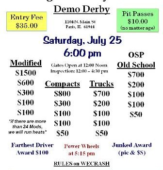 - ENTRY FEE: $35.00 Pit Passes $10.00 (no matter age) Grandstand: tbd
